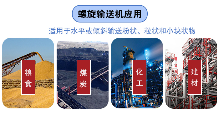 螺旋輸送機(jī)廣泛應(yīng)用于各行業(yè),如建材、化工、工業(yè)、煤礦炭、糧食等行業(yè),適用于水平或傾斜輸送粉狀、粒狀和小塊狀物料,如粉煤灰、石灰、水泥、飼料、肥料、砂漿、糧食、面粉等,物料溫小于200℃。