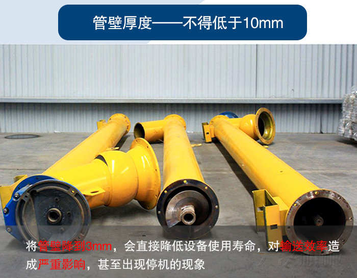 一般情況下,管式螺旋輸送機管壁厚度要求不低于10mm,有些廠家為了在其中賺取更多利益,將管壁降到了3mm,會直接降低設備使用壽命,對輸送效率造成嚴重影響,甚至出現停機的現象。