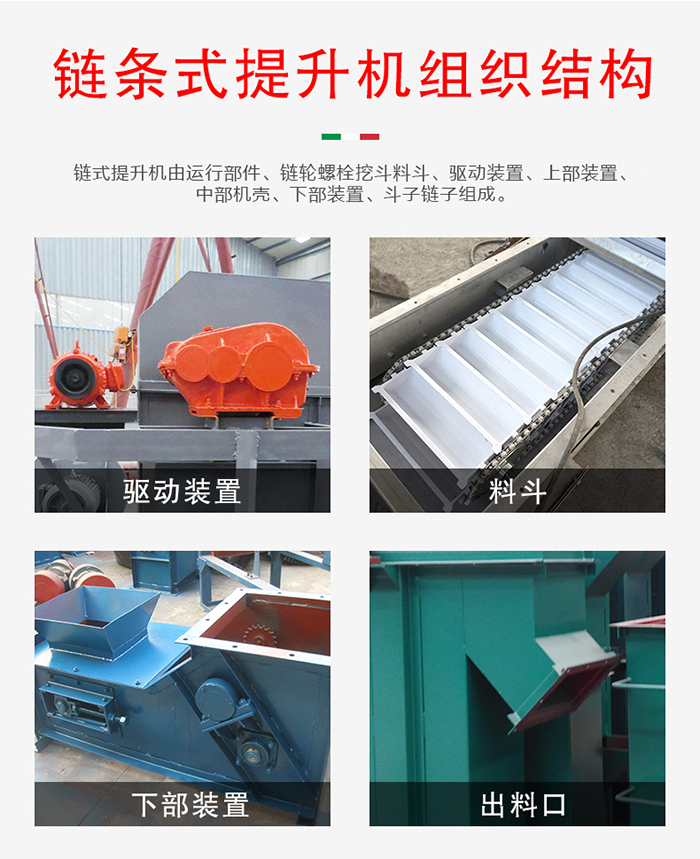鏈條式提升機由運行部件、鏈輪螺栓挖斗料斗、驅動裝置、上部裝置、中部機殼、下部裝置、斗子鏈子組成。