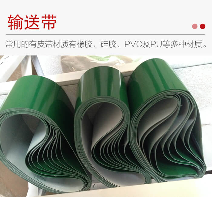 在皮帶輸送機(jī)上常用的有皮帶材質(zhì)有橡膠、硅膠、PVC及PU等多種材質(zhì)。橡膠帶適用于工作環(huán)境溫度-15至40℃之間。物料溫度在50℃以下,50℃以上的要求在訂貨時(shí)需告知廠家,可以選用耐高溫輸送帶。向上輸送散粒料的傾角12°至24°。對(duì)于大傾角輸送可用裙邊帶。