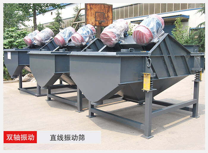 雙軸振動篩是利用同步異向回轉的雙不平衡重激振,篩面水平或緩傾斜,篩箱的運動軌跡為直線。